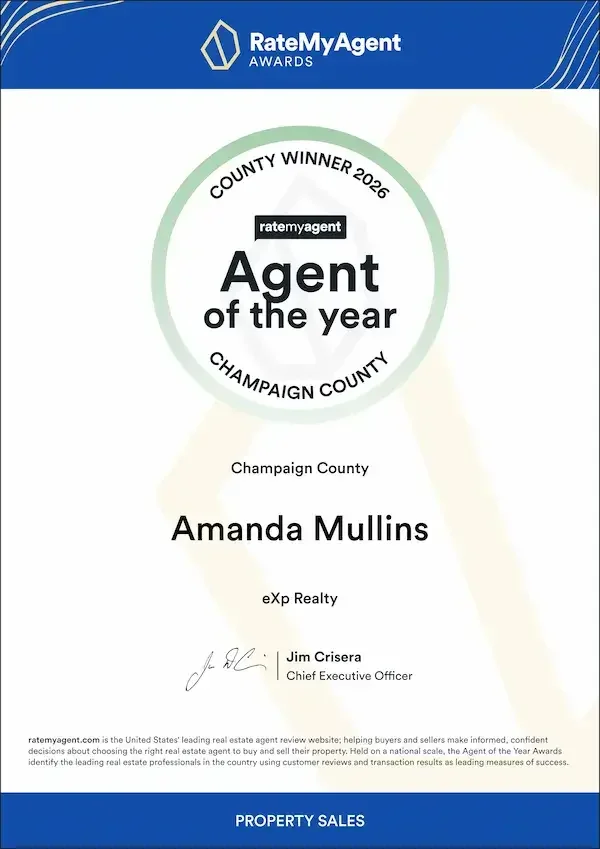 Recognized as the 2026 RateMyAgent Agent of the Year for Champaign County and ranked #2 Top Agent in Clark County based on customer reviews and transaction results.